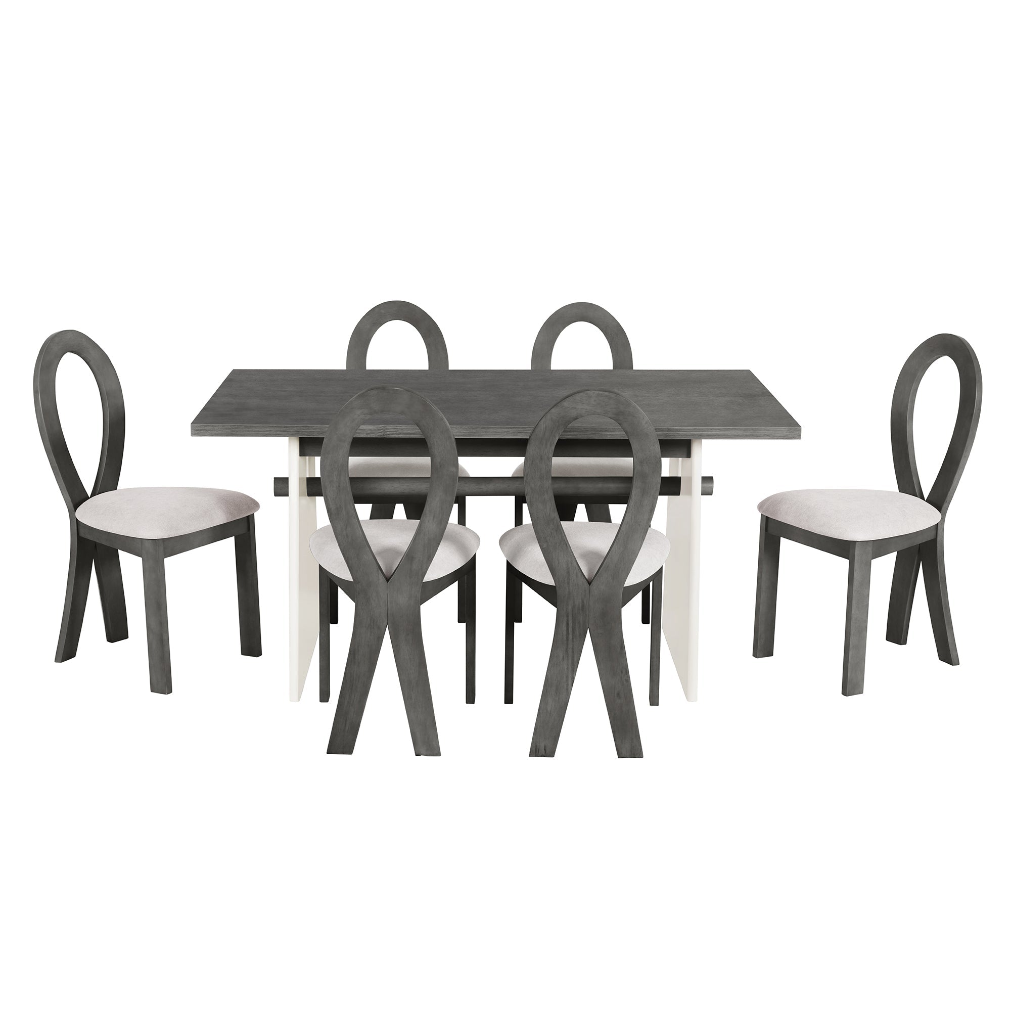 Highlights | Solid Rubber Wood Legs // Trestle Dining Table // 1.4”-thick Rectangular Table Top // Round Long Stretcher Under Top for Stability&Decoration// Irregular Block Table Legs //Upholstered Chair Seats // Teardrop-shaped Chair Cushions // Mermaid Chair Back Design // Set for 6 // Modern Style // 250lbs Weight Capacity for Table&Chair // Compact Dining Set(Middle 4 Chairs can tucker under top) |